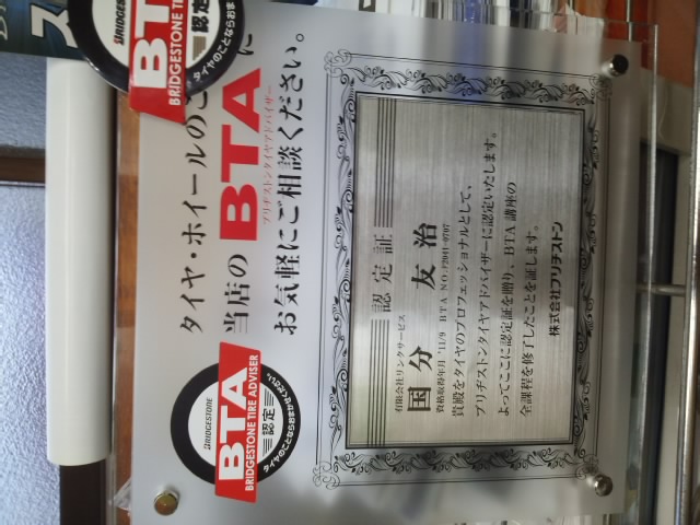 夏頃に受けたBTA(ブリヂストンタイヤアドバイザー)の認定証が届きました